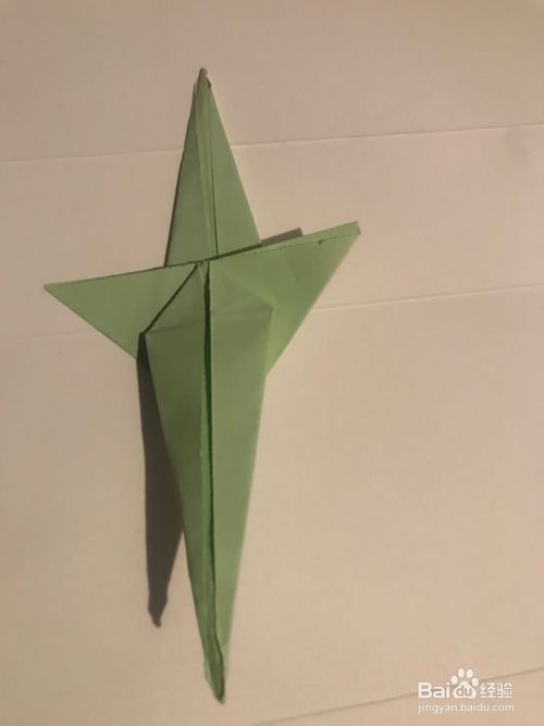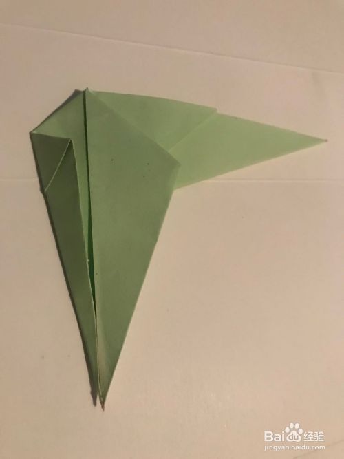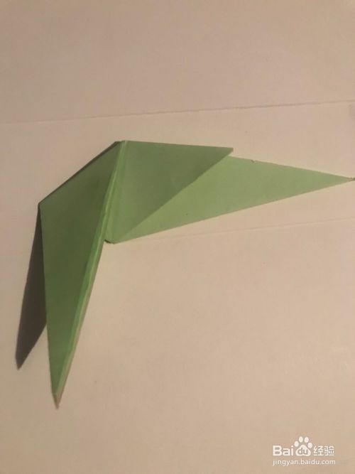 第六步 对折好之后把它左右翻过来 再把上面的翅膀翻到右边 然后拿起左边的长三角沿中线向下折叠 (方法同上)最后再折倒下面