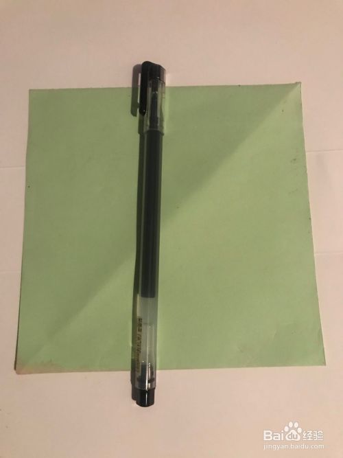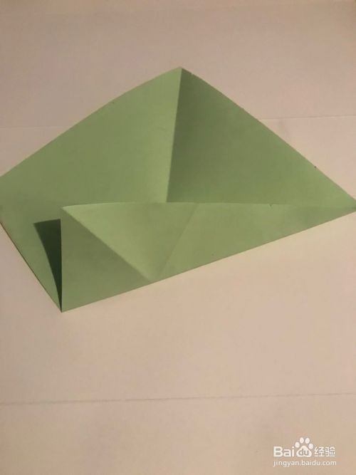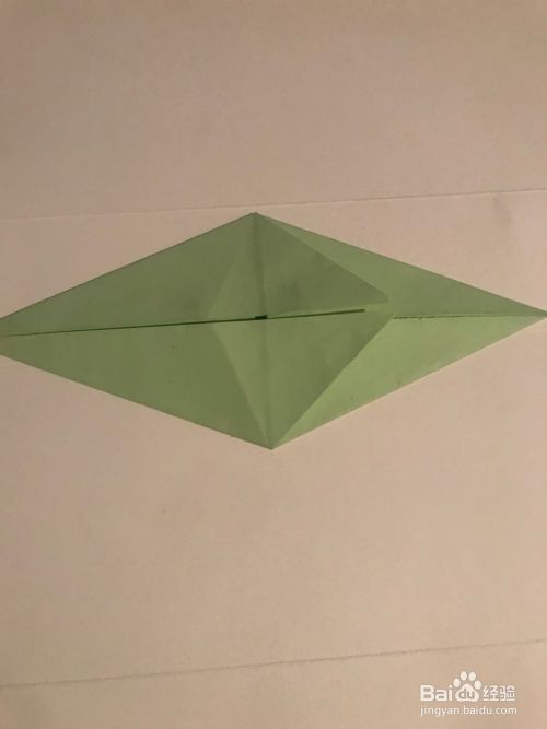 第一步 取一张正方形绿色彩纸一张 先折上两条对角线 然后对角线竖起来 按着左边角 再拿起下角向上折叠至中线 再按着右边角再拿起下角向上折叠至中线