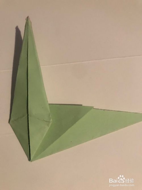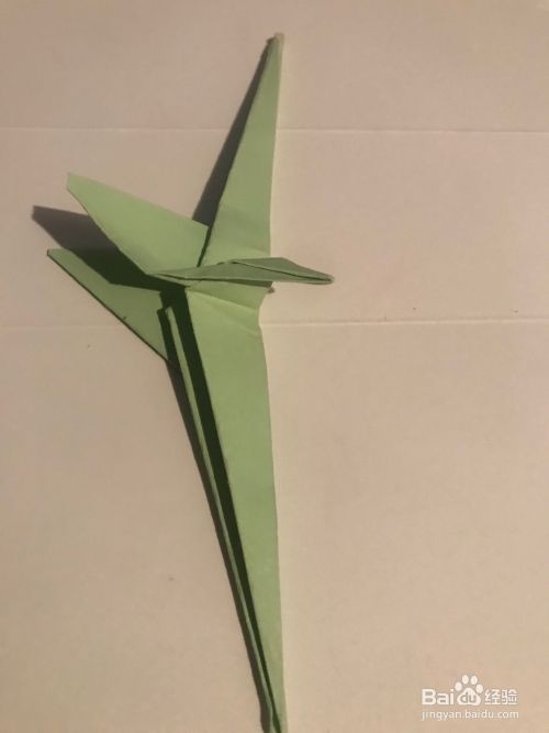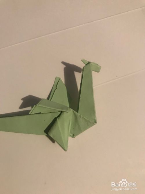 第八步 折完腿部之后 再把左边部分向上折倒 再取开 按折痕从当中向里挤折 然后在脖子大约上三分之一处折出头部 (方法与恐龙的头部相同) 最后再在它的双翅上折出两道折痕