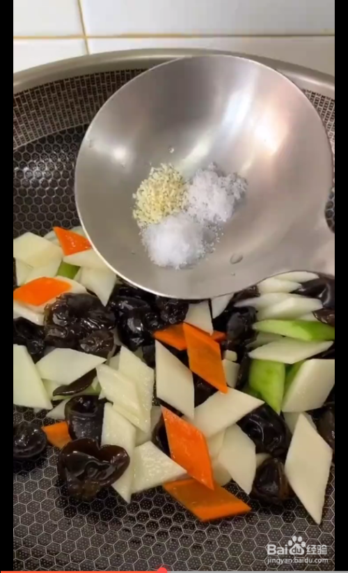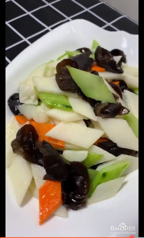 起锅放油蒜片,爆香放入山药和木耳。放入黄瓜片,胡萝卜加盐,鸡精,白糖调味,淋上少许水淀粉和醋即可