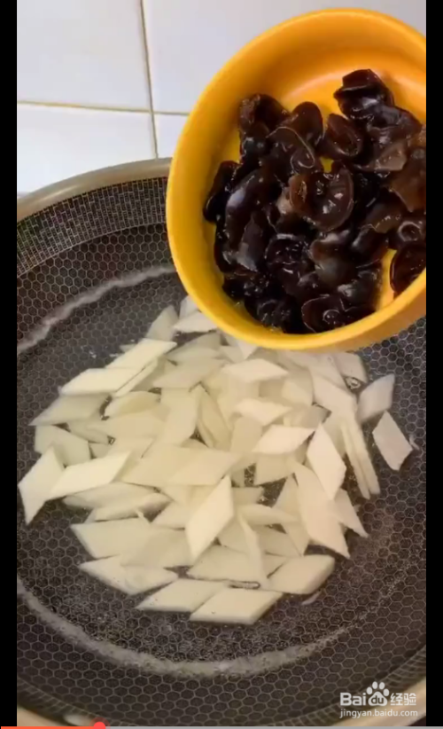 锅烧水加盐,水开放入山药。再放入木耳。开锅后煮一分钟,捞出。