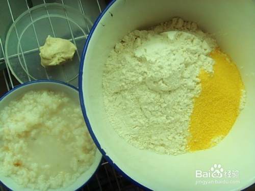 准备老面团10克----我们这边叫面引子,就是上次发面后密封留在冰箱里的,玉米粉40克,面粉200克,剩米粥100克备用。