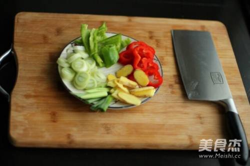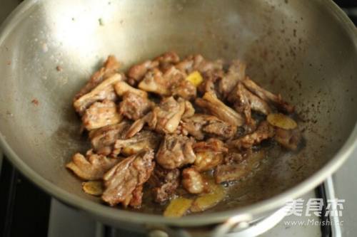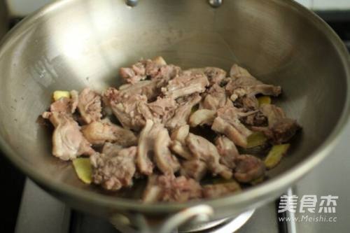 锅里烧油,下姜片炒香,再放入鸭块,炒至鸭皮变金黄