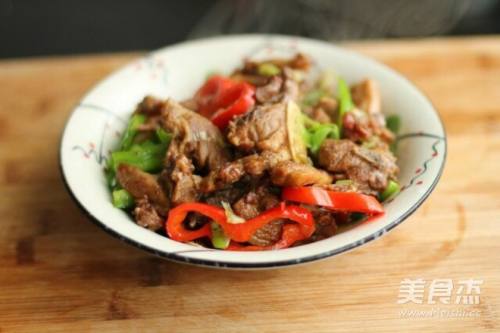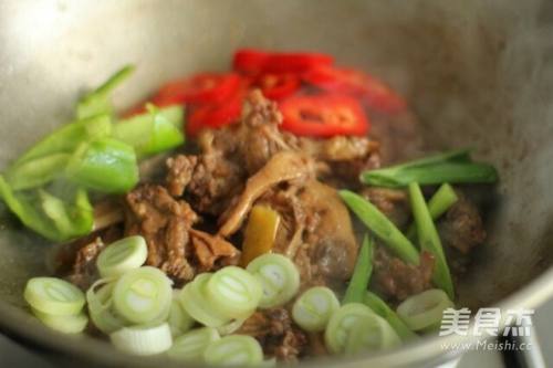 当焖鸭子的汤汁剩余少量时,下配菜翻炒。加一勺盐搅拌均匀即可盛出。