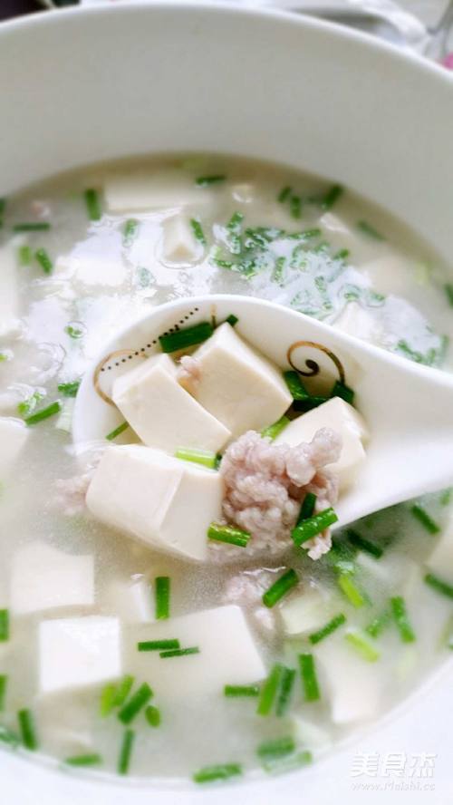 豆腐烧开后放入事先备好的肉末(水一同倒入),待烧开后放姜丝,去掉上面的浮沫,肉煮熟后放入盐,鸡精,葱半分钟即可盛出