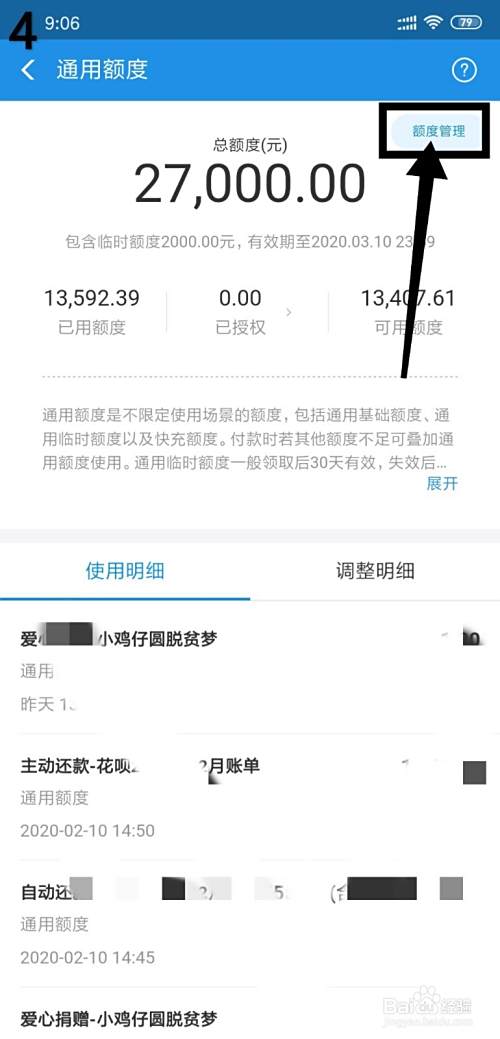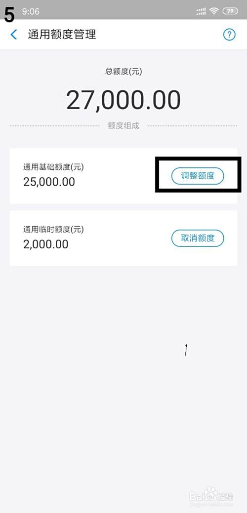 第五、随后便进到额度管理页面,点击下方的“调整额度”解冻花呗使之正常使用;
