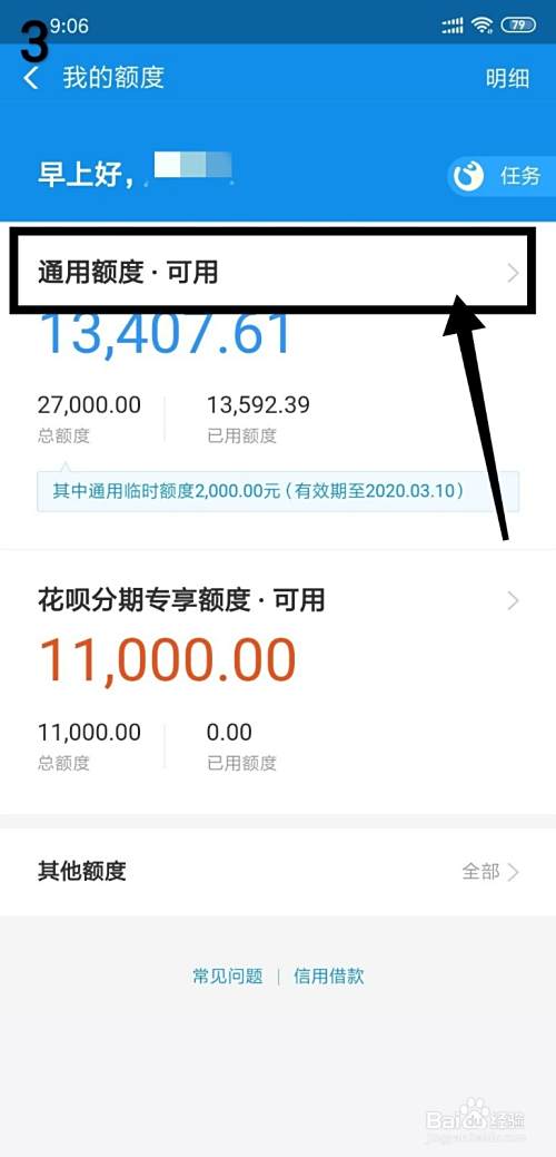 第三、解冻花呗的一个方法是调整额度,所以点击“通用额度·可用”;