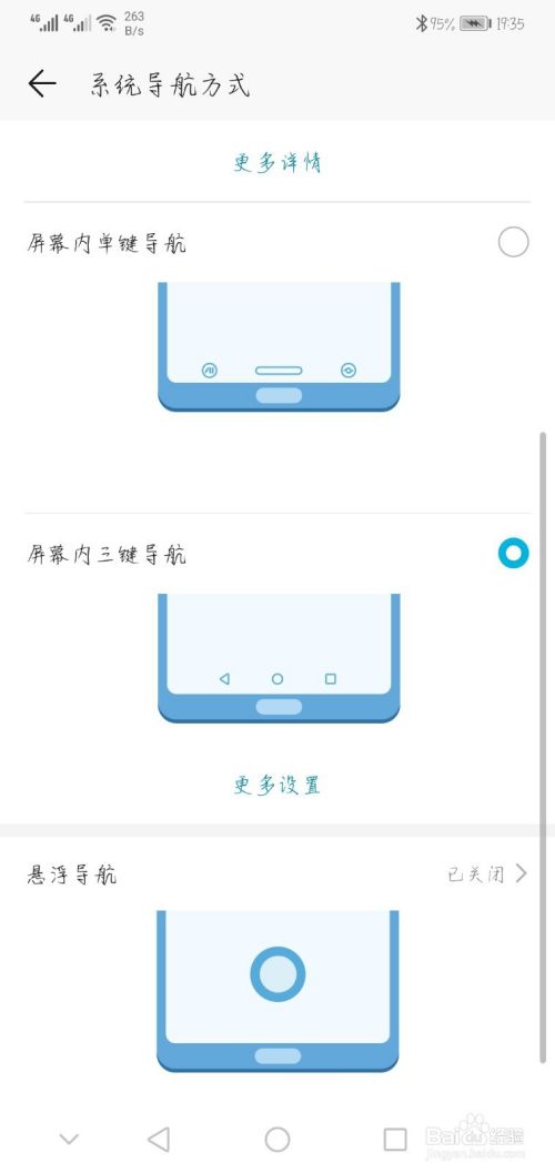 打开系统导航方式后,可以看到该页面有多种多样的导航方式,像手势导航、悬浮导航等等,还有就是我们想要的屏幕内三键导航了,选择设置即可。