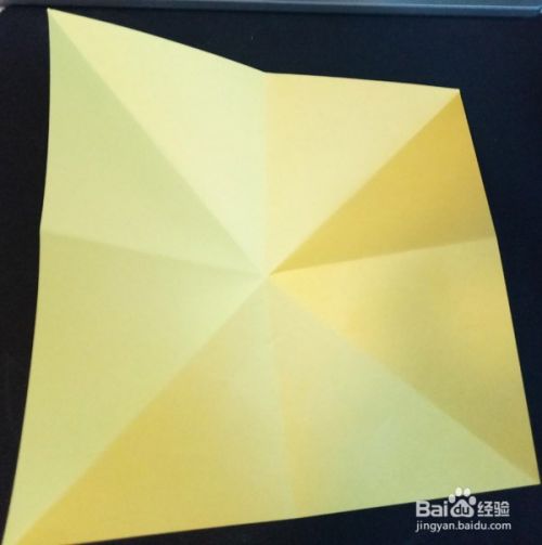 展开后的彩纸,沿着对角线方向,折叠出图1的效果来,然后再重新展开,再沿着另一条对角线对折,之后展开来就是下图2所示的效果。
