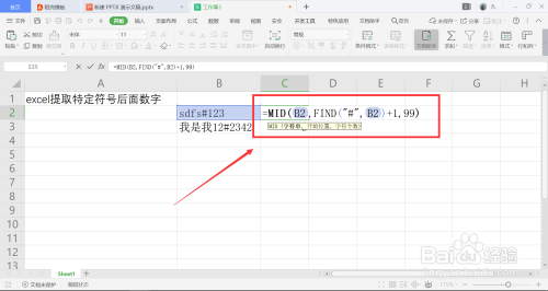继续使用MID函数,补全公式=MID(B2,FIND("#",B2)+1,99)。