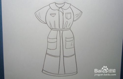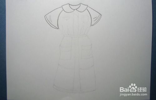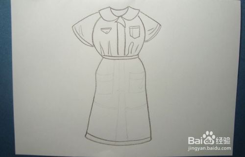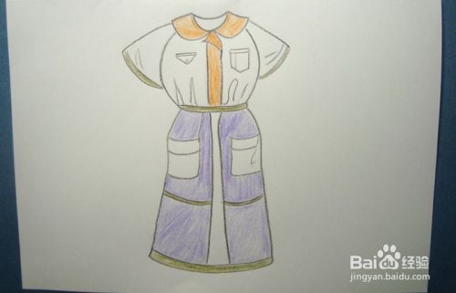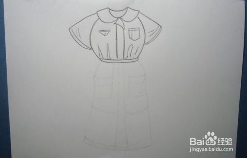 接着,用黑色的彩铅笔画出短袖长裙上衣的图形部分,并画出衣服上的口袋图形,如下图所示。