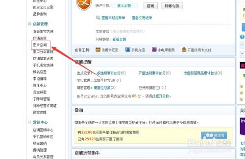 在卖家中心页面点击店铺管理选项下面的图片空间选项,打开图片空间页面;