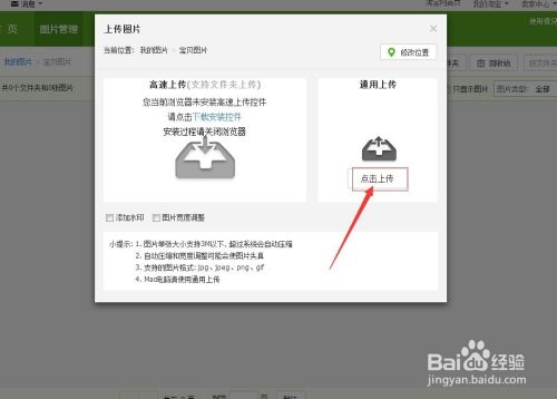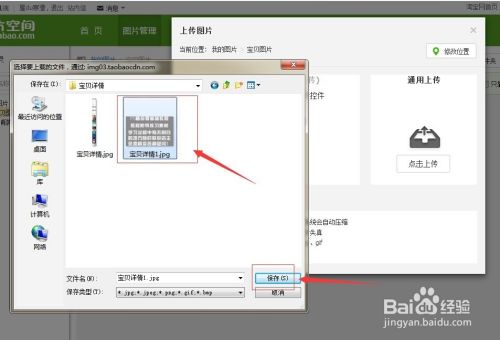 打开图片空间后点击页面顶部的上传图片按钮,在弹出的对话框中选择点击上传按钮,选择存储在电脑里的宝贝详情图片,点击保存按钮,将图片上传到图片空间;