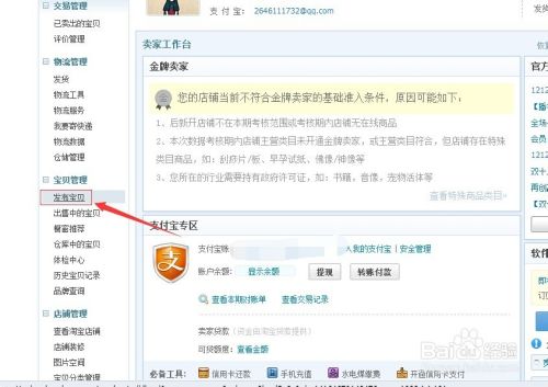 上传成功后,回到卖家中心页面,点击宝贝管理选项下面的发布宝贝选项,打开宝贝发布页面;