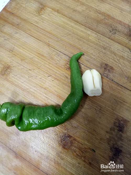 接着选一个不算太辣的青椒,还有蒜头剥好,一并清洗干净。