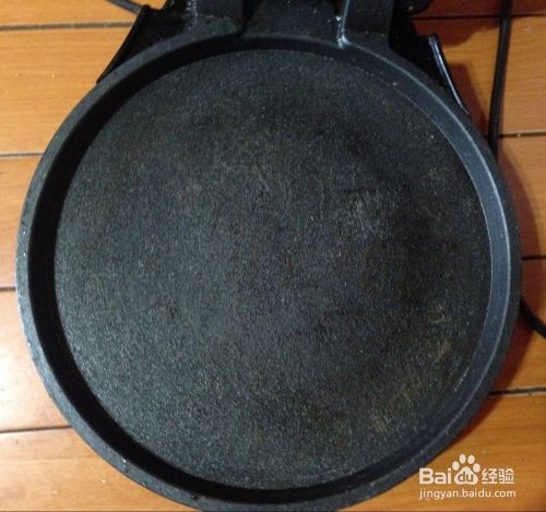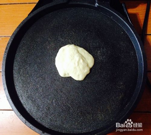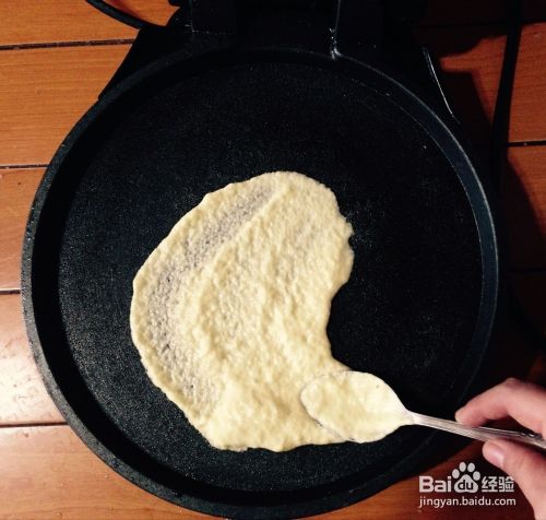 用小勺挖两勺的煎饼面糊在电饼铛上面。