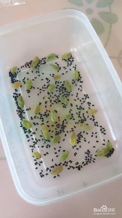 在方形的保鲜盒底,撒一些黑芝麻和葡萄干。