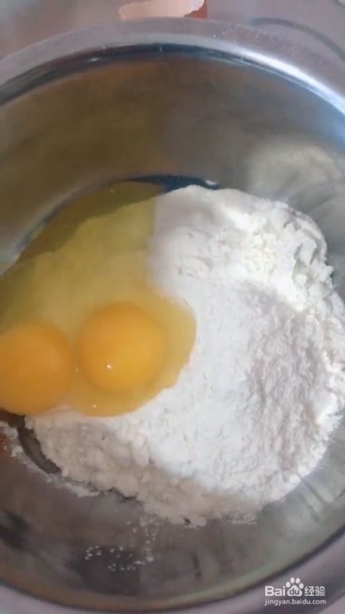 打两个鸡蛋到面粉盆里,加适量的水,和面。