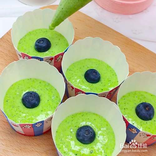 再把发酵好的面糊装入裱花袋,挤入准备好的纸杯里,三分之处放入蓝莓,再挤入面糊。