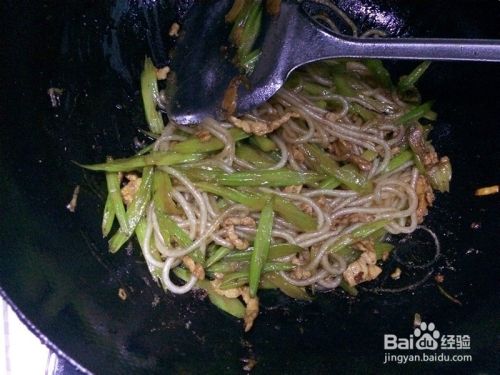 肉炒稍微变干后加入芹菜翻炒,最后加入粉条,同时放入少许花椒粉,翻炒。