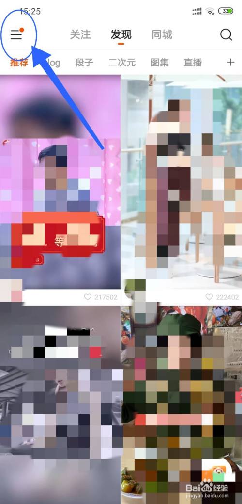 第一、打开快手App,在主页面的上方点击打开“三”图标;