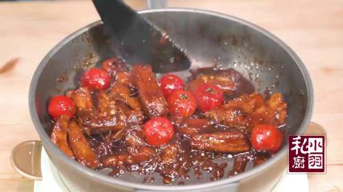 2转小火把排骨推到一边,放入冰糖,炒到冰糖完全融化,翻炒排骨沾上汤色。