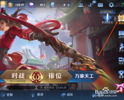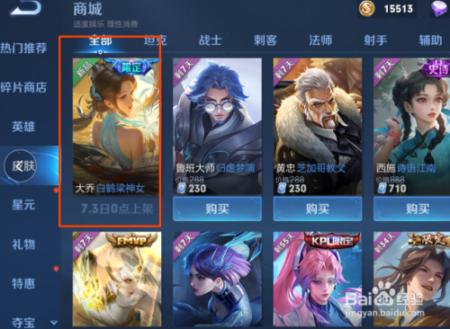 进入到商城页面,直接在左边,点击皮肤,切换到皮肤页,看到大乔新皮肤白鹤梁神女上线预告