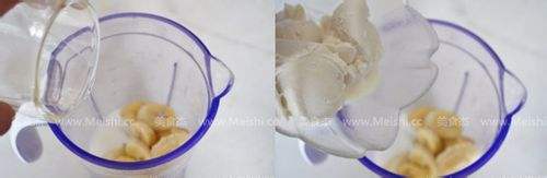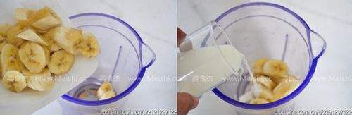 先将香蕉切成丁状倒入搅拌机中,再加入牛奶