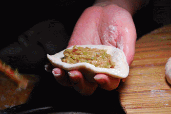 这时候开始调馅,把馅料混合,加入调料,调完后就包包子,将馅料放在皮上,包好