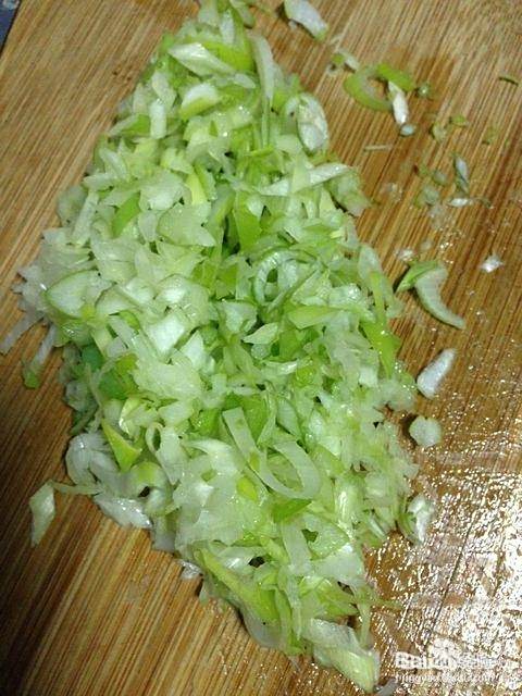 锅里放水,加一点姜片和料酒把猪肉煮熟。煮熟的猪肉晾凉之后切成碎颗粒,加点云腿进去会更香,也要切成粒。小葱,切成葱末,放好备用