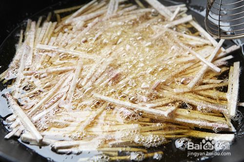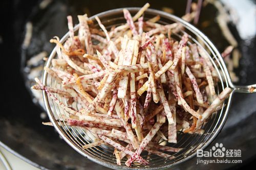 锅内放入适量油把油烧热,可以扔一根芋头丝进去如果立刻冒泡浮起就证明油够热了,然后倒入芋头丝炸;