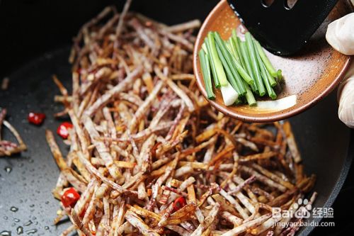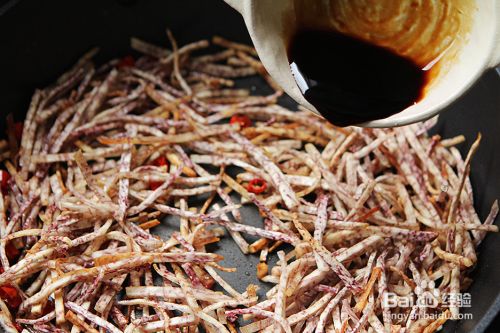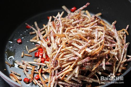 倒入炸好的芋头丝煸炒;