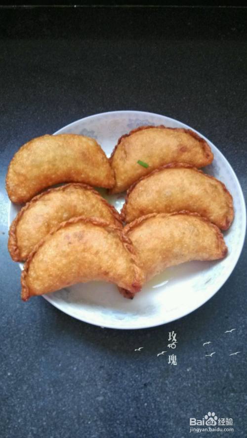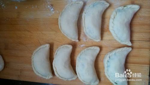 面片包入韭菜馅,这是包好的,细节图没有拍,自己边做边拍顾不过来啊,直接包成饺子样即可,我把边缘捏成了花边,美观点哈