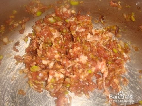 猪肉买的时候直接让店家绞成了小丁,葱、姜切碎放进肉馅中,加酱油、油、盐、鸡精、料酒、五香粉拌匀。