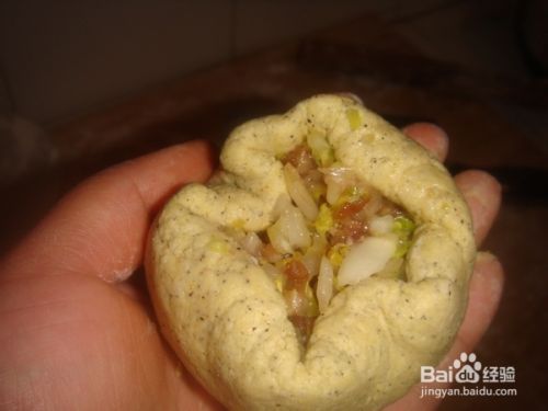 取馅放到面皮上,用左手掌心托住面轻轻的转圈,右手虎口收口。
