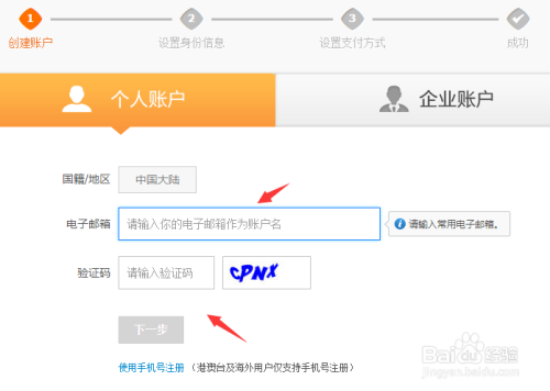 输入我们想要注册的邮箱号码,再输入图中的验证码就可以,我们在点击下一步,如图所示。