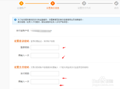 现在我们就来填写身份信息吧,输入我们的登录密码和支付密码,密码要自己能记得住的,不然到时候登录时就忘记了。