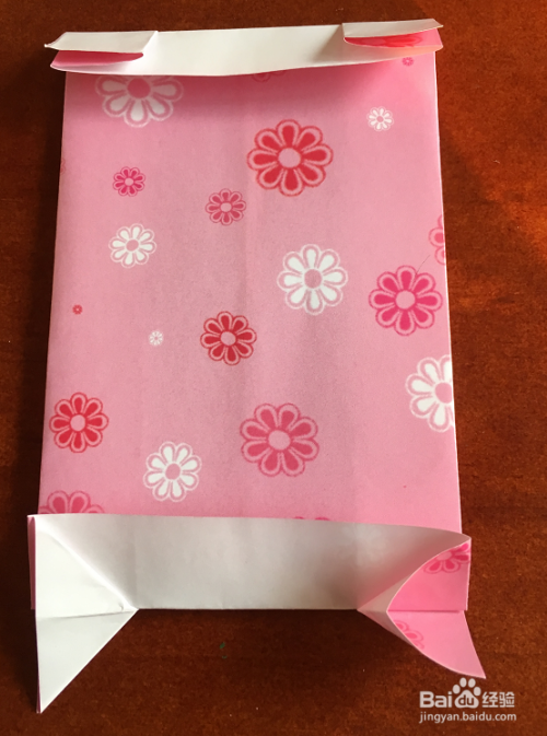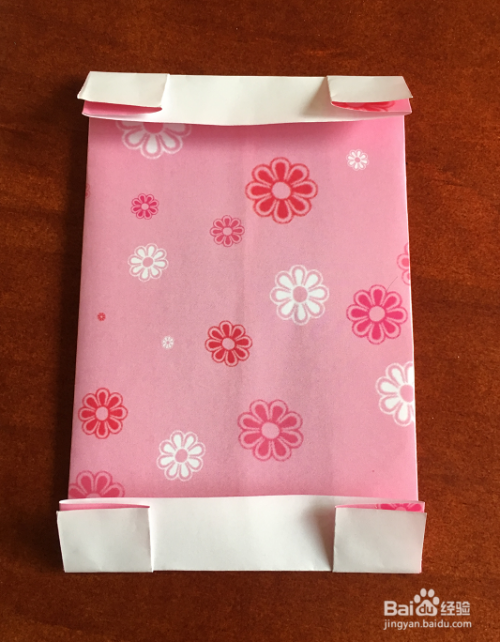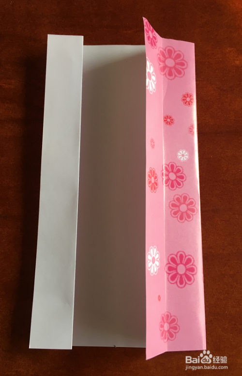 彩纸翻面,将两边彩纸向中间折痕折去。
