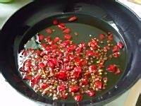 第六步:另起锅放油,将油熬至稍有青烟冒出时,放入花椒和干辣椒段迅速翻炒几下,然后将它们和油一同淋在鱼片上。