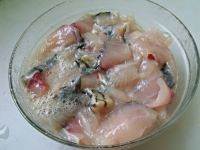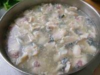 第二步:鱼中段去骨去肉,切成薄片,用水反复淘洗直到水清澈,然后用盐、胡椒粉、蛋清腌渍10分钟,放入3茶匙淀粉抓办匀备用