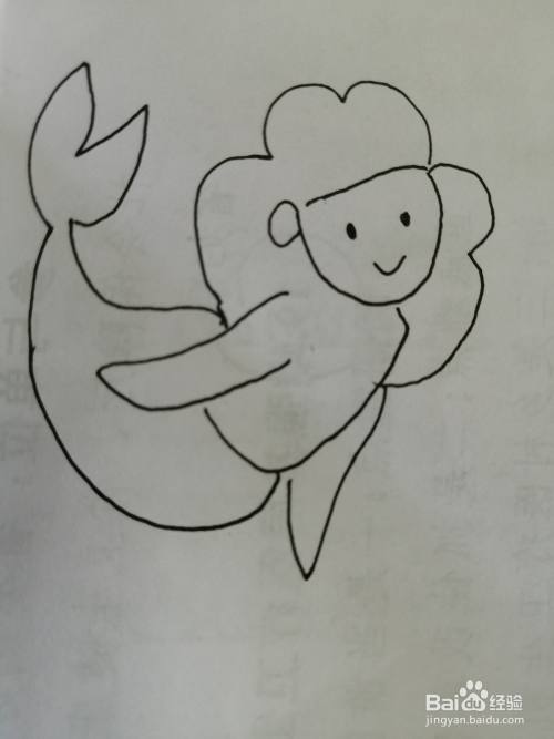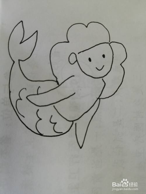 第六步,接着把简笔画美人鱼的身体和可爱的尾巴画出来。