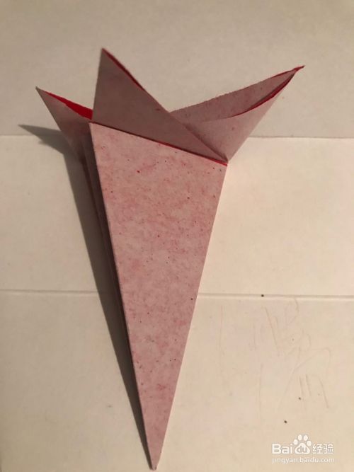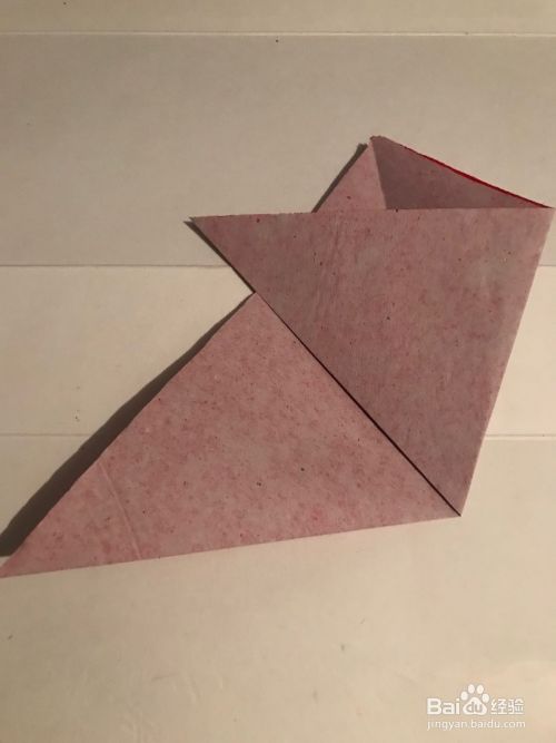 第一步 先取一张16厘米长宽的正方形红色彩纸 把它从下向上的对角折叠 然后再从右向左对角折叠