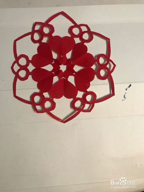 第七步 剪完外围多余的彩纸之后 再剪里面的细节和镂空部分 还有其它涂实的地方 都剪完之后 展开压平 一副漂亮的心心相印纹样团花就裁剪完成了