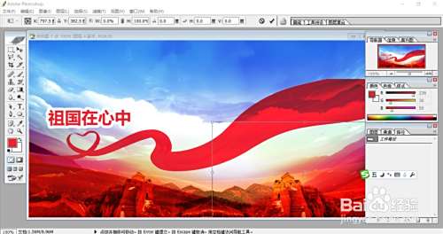 要画出祖国在心中这个插画就要把一些必要的元素呈现在画面之中,这里我们使用了长城与华表这样两个素材,再通过一个红绸缎的创意让这种心中的感觉呈现出来。
