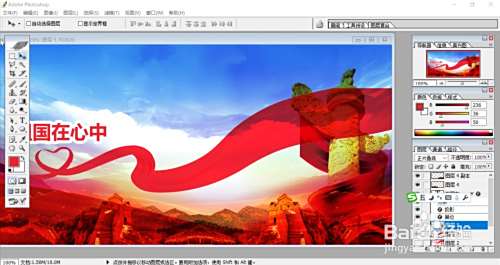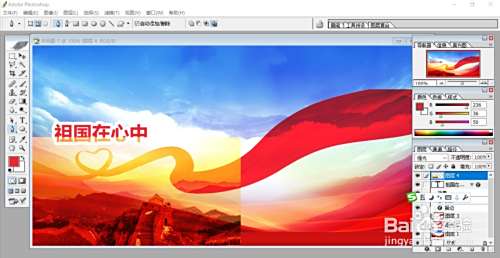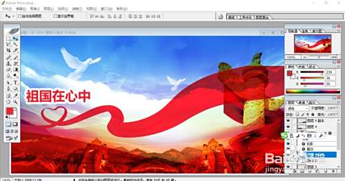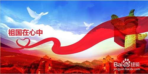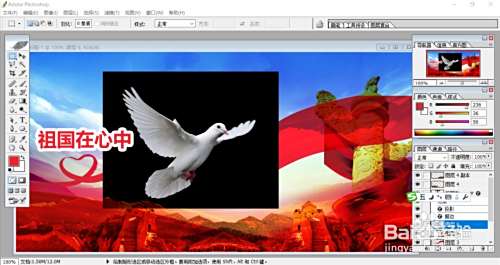 最后,我们导入一个鸽子,再设置图层模式为滤色,复制鸽子到飘带的右侧位置并改变大小,完成祖国在心中插画。