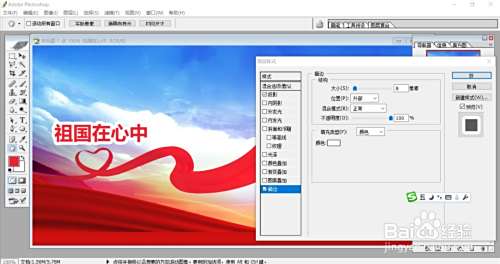 给文字做出一个阴影与描边的图层效果,把文字放到心形的上方位置。再导入一张长城的图片,我们设置图层模式为强光。
