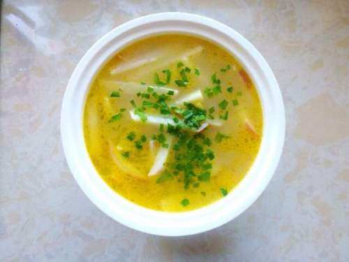 6锅中加入浓汤宝和盐,继续煮2分钟。起锅倒进放有粉丝的碗中。撒上葱花,齐活,开动吧!