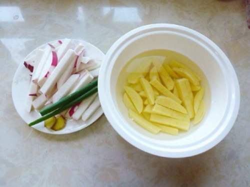 准备食材。萝卜和土豆切成长条(或细丝)。姜切片。