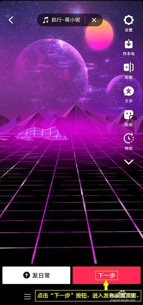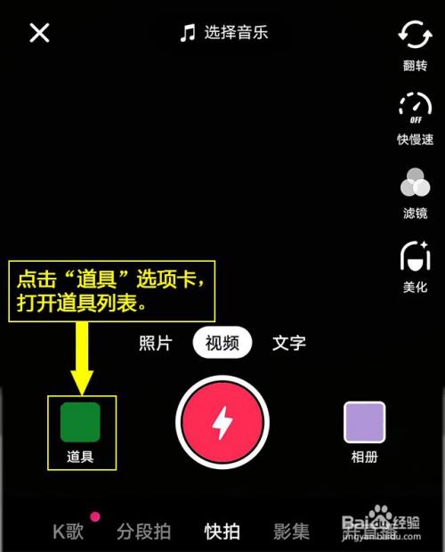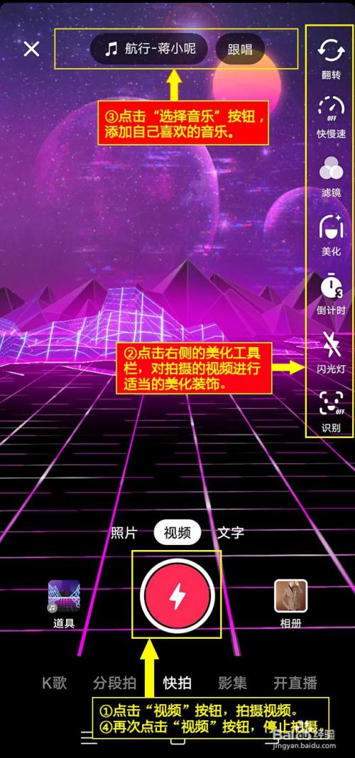 拍摄视频。点击“视频”按钮,拍摄视频,点击右侧的美化工具栏,对拍摄的视频进行适当的美化装饰,点击顶部的“选择音乐”按钮,选择使用自己喜欢的音乐,最后,再次点击“视频”按钮,停止拍摄。