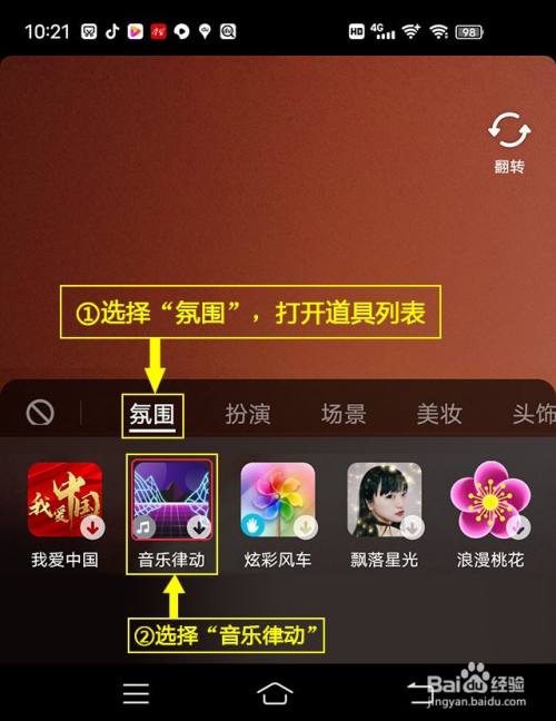 选择道具。点击“氛围”选项卡,打开道具列表,选择拟使用的道具。